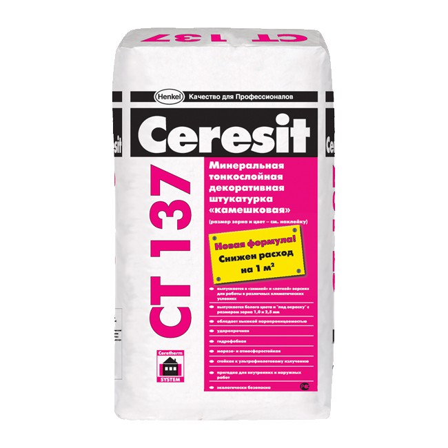 Штукатурка Ceresit CT 137 предназначена для выполнения декоративного тонкослойного покрытия на бетонных основаниях, традиционных штукатурках, гипсовых основаниях, плитах ДСП, гипсокартоне и т.п.